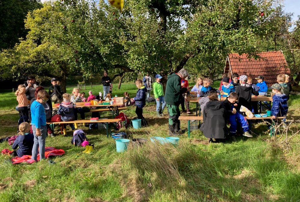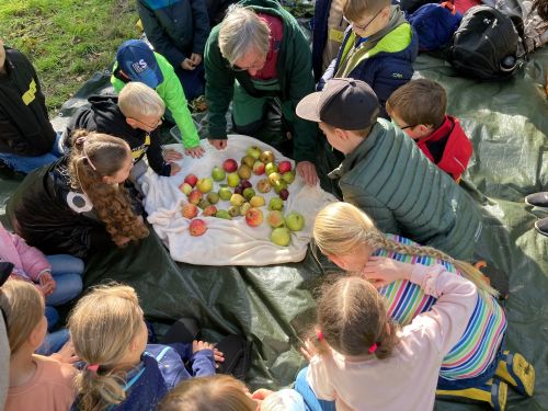 Das hat Spaß gemacht! Unterricht auf der Streuobstwiese. Die Naturschutzstiftung Heidekreis machte es möglich. Zwei Schulklassen konnten das Wunder Streuobstwiese entdecken. Zwei Streuobstwiesenpädagogen zeigten den Kindern besondere Apfelsorten wie Doppelter Prinz, Kaiser Wilhelm, Jamba, Jonathan, Ingrid Marie ……. Die durften auch probiert werden. Die Geschmäcker der Kinder waren sehr verschieden. Es gab keine eindeutige Lieblingssorte. Den Apfelsaft fanden alle sehr lecker. Die zweite Gruppe war den Tieren auf der Spur, die auf der Wiese leben und auch mit probieren wollten: Bienen, Wespen, Schmetterlinge, Frösche, Kröten, Schnecken …. „Wir kommen wieder“, war der Wunsch der Kinder. Vielleicht ja zum Apfelerntefest am 3. Oktober mit den Eltern. Wir freuen uns über jeden Besuch.